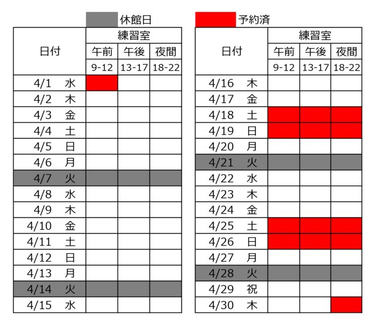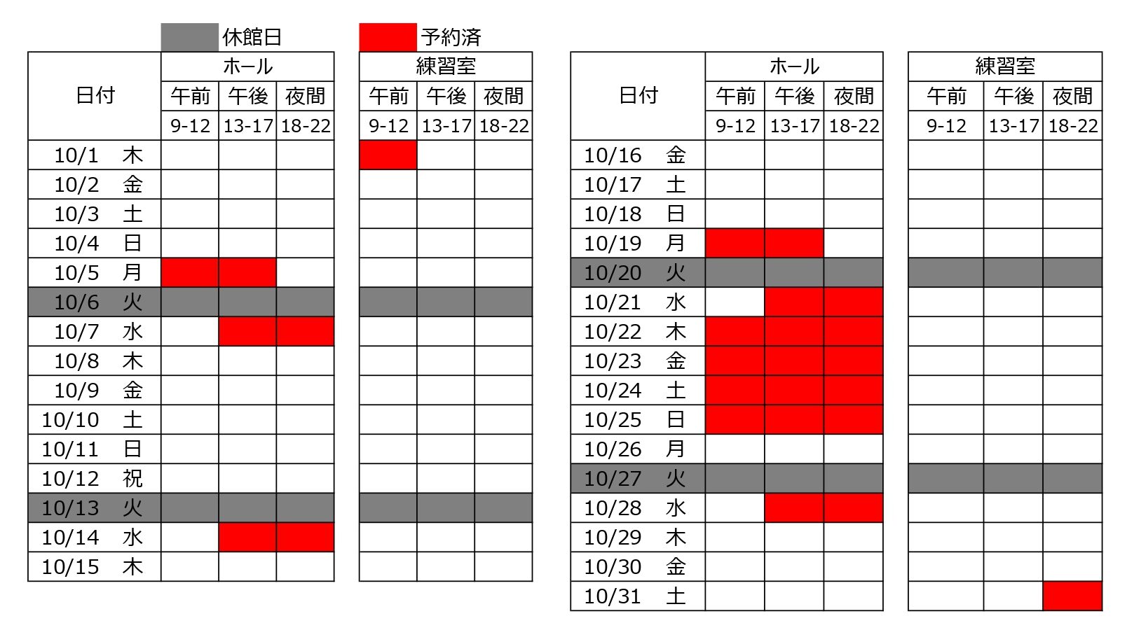 *インターネット(練習室のみ)による仮予約は10/4(土)9:00より可能です